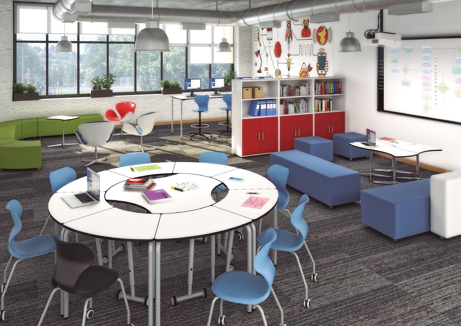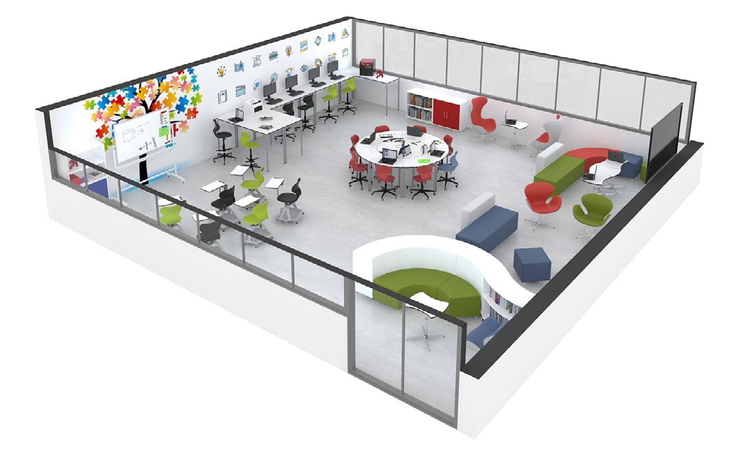 Un’aula ordinata con postazioni di lavoro ben organizzate