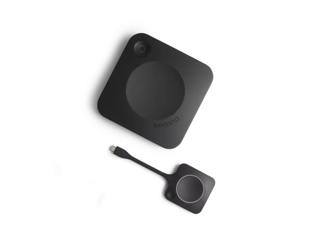 ClickShare Conference è un sistema di videoconferenza wireless per riunioni ibride, composto da una base unit e un pulsante di connessione da collegare al laptop.