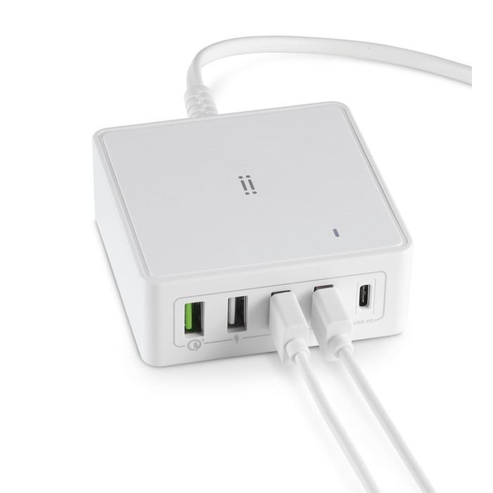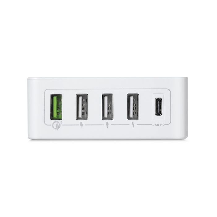 Il caricatore da tavolo aiino Premium 60W a 5 Porte è dotato di: Una Porta USB-C con Power Delivery per MacBook, MacBook Air, iPad PRO 2018 e successivi; 3 Porte USB per iPhone XS/Max/XR/X/8, Galaxy S9/S8 e altri smartphone; ed 1 porta USB Qualcomm.