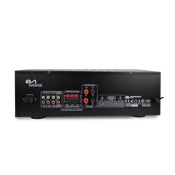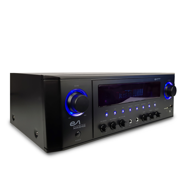 Amplificatore stereo in grado di amplificare 2 casse anteriori, 2 posteriori e un diffusore centrale. Possiede doppia uscite RCA destinata a subwoofer e doppio ingresso 6,3mm per atrettanti microfoni opzionali. Sono previsti ingressi RCA per segnali esterni (AUX e DVD) e una presa frontale da 3,5mm per un lettore MP3 esterno. Sulla parte frontale trovano posto una porta USB e una SD per la lettura di brani Mp3. Un modulo bluetooth consente lo streaming audio da telefoni o tablet mentre i comandi frontali permettono la regolazione dei volumi, tonalità e la scelta della sorgente sonora. L’ampio display mostra le principali informazioni compreso il nome del brano riprodotto. Telecomando e modulo radio FM completano questo straordinario amplificatore che non può mancare nelle moderne abitazioni.