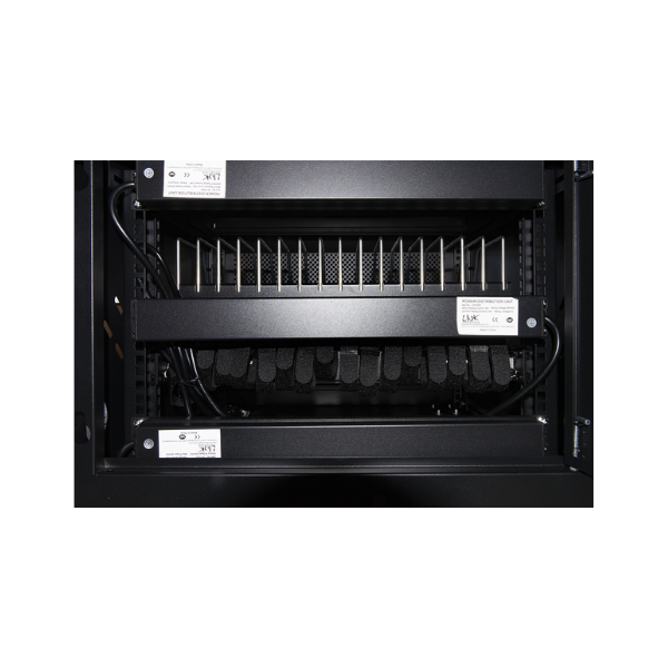 Con: 2 multiprese da 8 porte universali 220 Volt Schuko/Italiane tripolari e spina 16A tripolare italiana 1 multipresa con 12 prese USB 3.4A 5 Volt Le multiprese sono posizionate nella parte posteriore sui montanti 19”