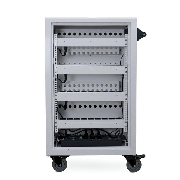 Tre ripiani fissi con 12 paratie divisorie in plastica dotate di passacavi integrato per l’alloggiamento dei dispositivi in posizione verticale e fori per il passaggio del cavo di alimentazione nello scompartimento posteriore.