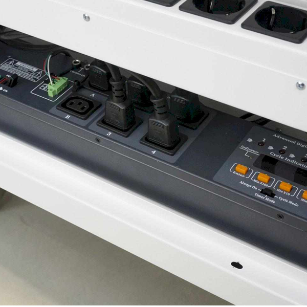 Centralina per la temporizzazione dell’alimentazione in simultanea su tutte le prese o in sequenza temporizzata per evitare sovraccarichi.