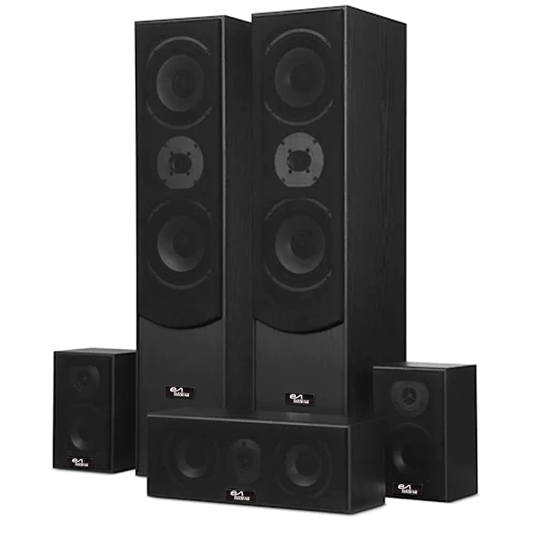 Combinazione di diffusori destinati all’home-cinema. 2 diffusori a colonna con sistema bass reflex, doppio woofer ad alto rendimento e tweeter direzionale da 35mm sono progettati per il posizionamento anteriore destro e sinistro. Un diffusore centrale sempre a 3 vie e 2 speakers posteriori surround con woofer da 10cm completano il set. Tutti i diffusori sono realizzati in legno verniciato in colore nero con griglia frontale removibile. Operano a 8 Ohm e possiedono connettori standard a vite/banane sulla parte posteriore.