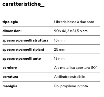 Dim. 90×46,3x h.81,5 cm, spessore pannelli struttura 18 mm, spessore pannelli ripiani 25 mm, spessore pannelli ante 18 mm, cerniere ad ala metallica apertura 110°, serratura con cilindro estraibile e maniglia in polipropilene bianca.