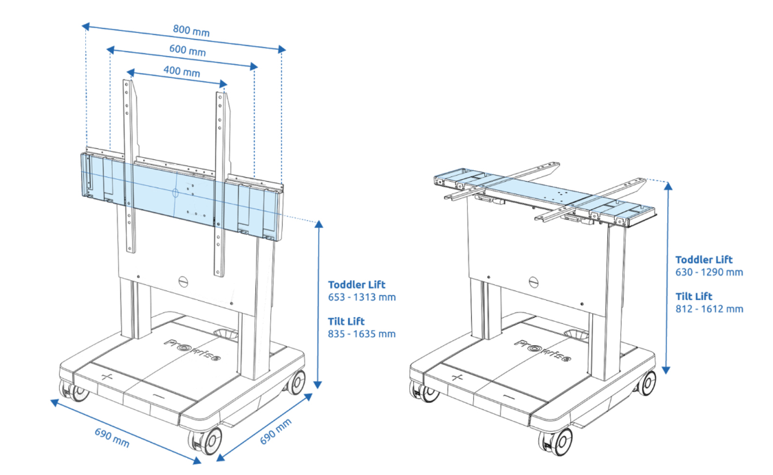 Il nuovo carrello iPro Toddler Lift è in grado di sostenere tutti i monitor della gamma Prowise con una portata massima fino a 75 Kg. È possibile tuttavia installare anche altri monitor interattivi.