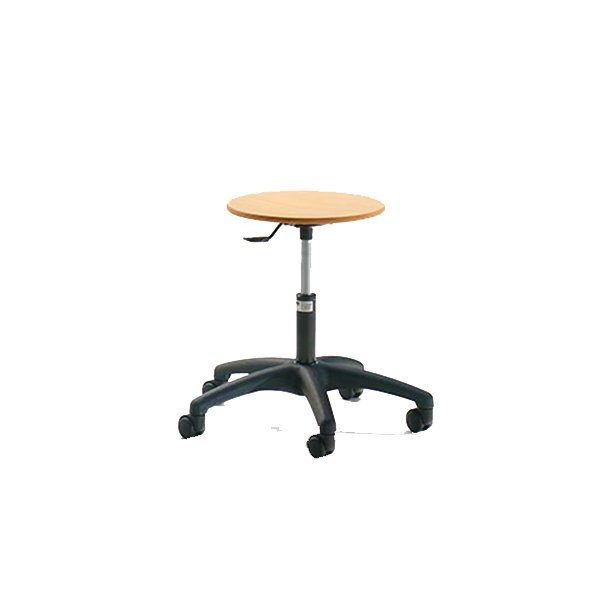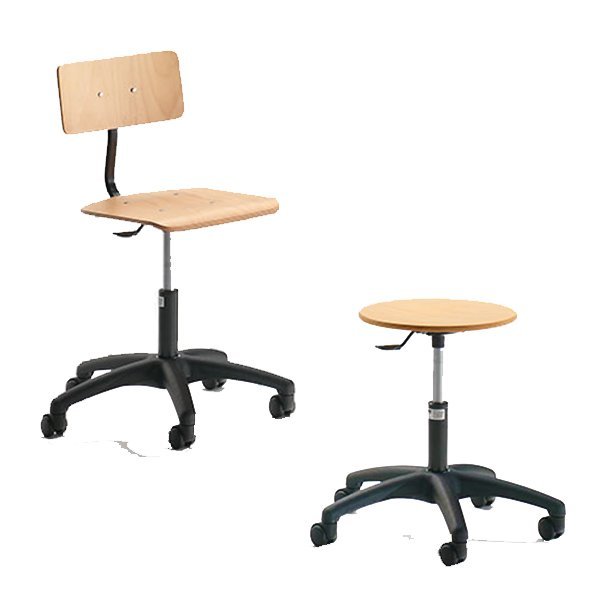 realizzato con struttura in acciaio e base in polimero plastico. Regolabile in altezza con pistone pneumatico. Seduta in faggio verniciato naturale. Disponibili con schienale regolabile in altezza e in profondità.